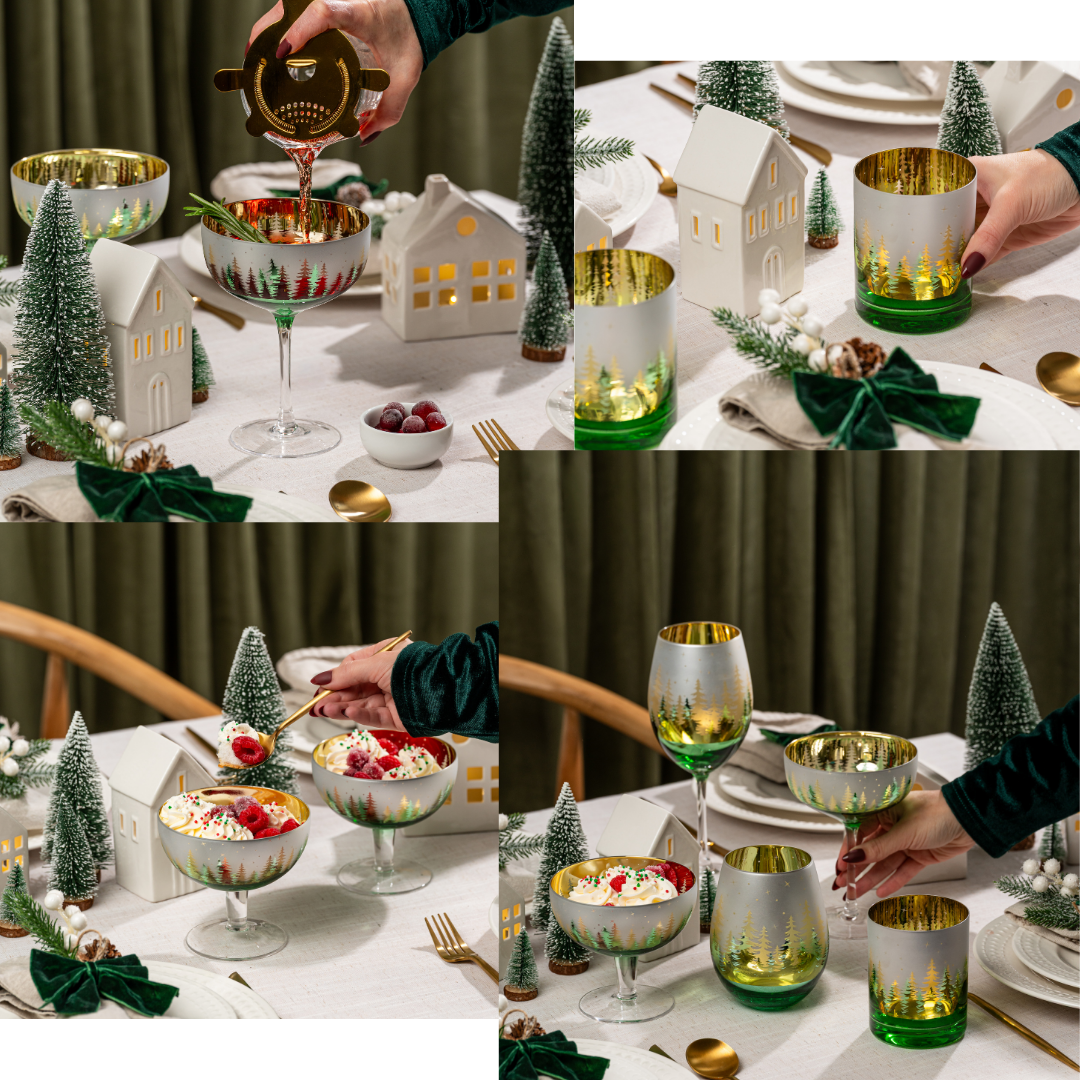 Engraved with a nostalgic wintery scene of pine trees, these Christmas wine glasses are designed with a shimmery silver & green finish, and a dazzling gold interior that will light up the room.