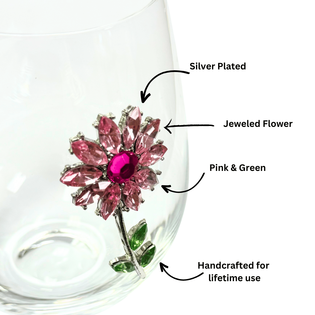Featuring delicate & shimmering pink, silver, & green jewels on a silver plated flower for a dazzling sipping experience.