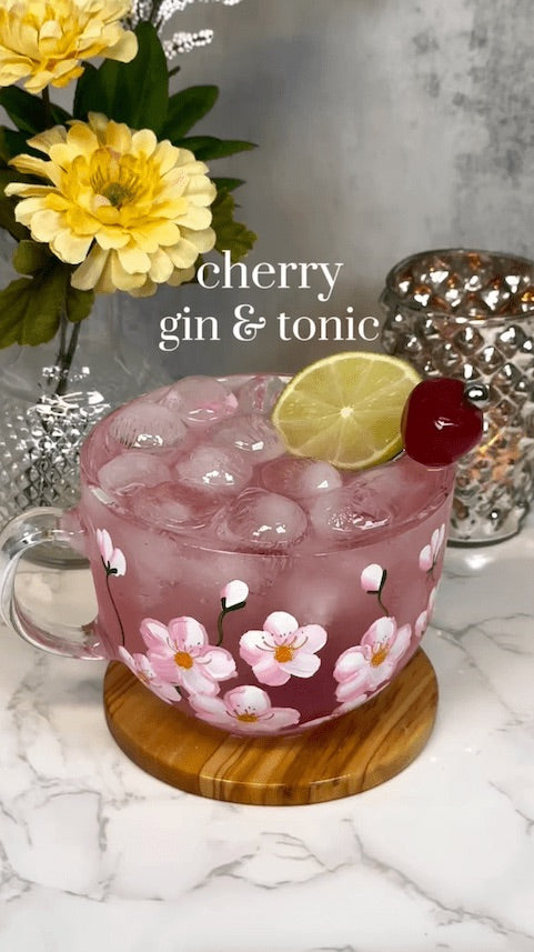 The lifelike and vibrant cherry blossom design is carefully detailed, showcasing shades of pink and white, creating a stunning impression of natural beauty. The entire surface of the mug is covered in cherry blossoms, making it a perfect addition to any glassware collection.