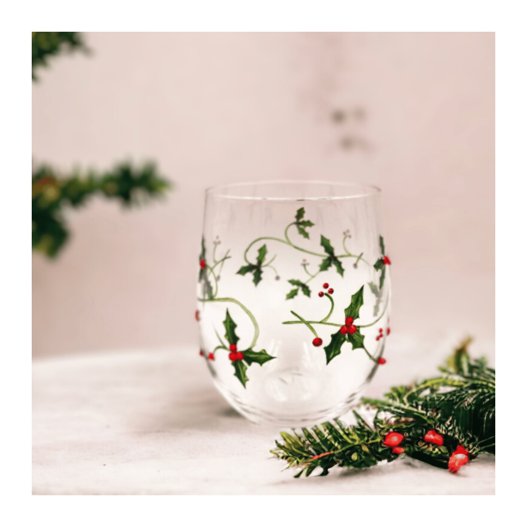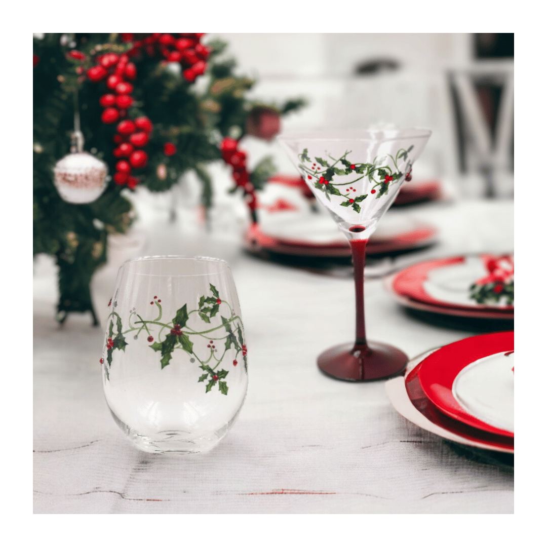 Our Martini Glasses are hand-blown with a striking red stem featuring painted ivys with red jeweled berries for a beautiful holiday design.