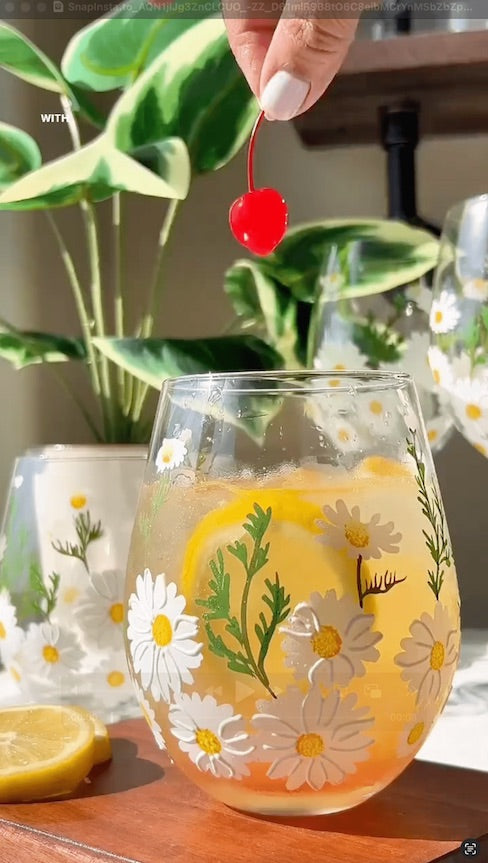 The glass is painted with a beautiful design of delicate daisies in full bloom. The daisies are carefully painted with delicate details, adding a playful and artistic touch to the glass. Our unique texture paint creates a textured outline of the daisies for a unique feel.