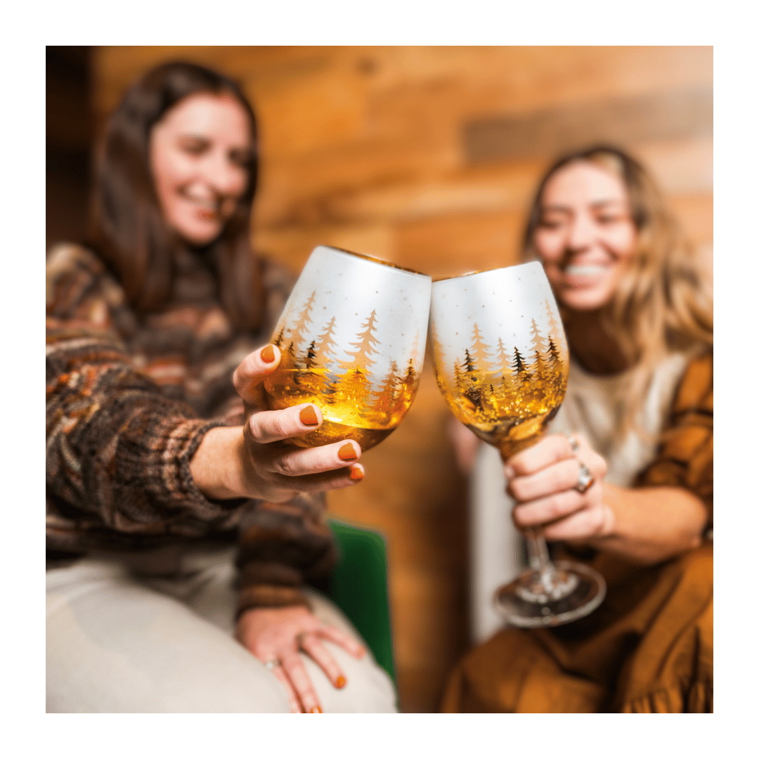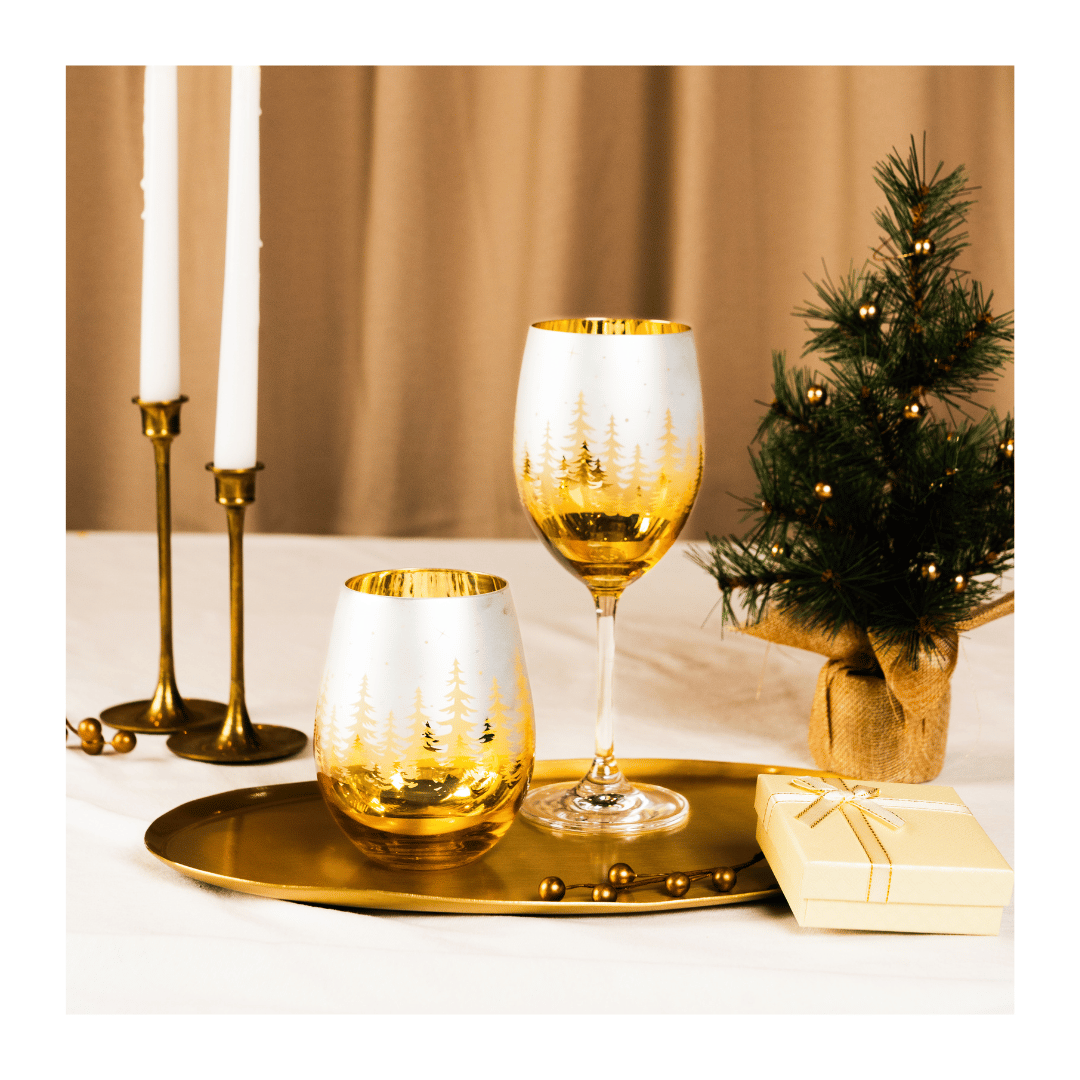 Engraved with a nostalgic wintery scene of pine trees, these glasses feature a shimmery silver and gold finish, and a dazzling gold interior that will light up the room.