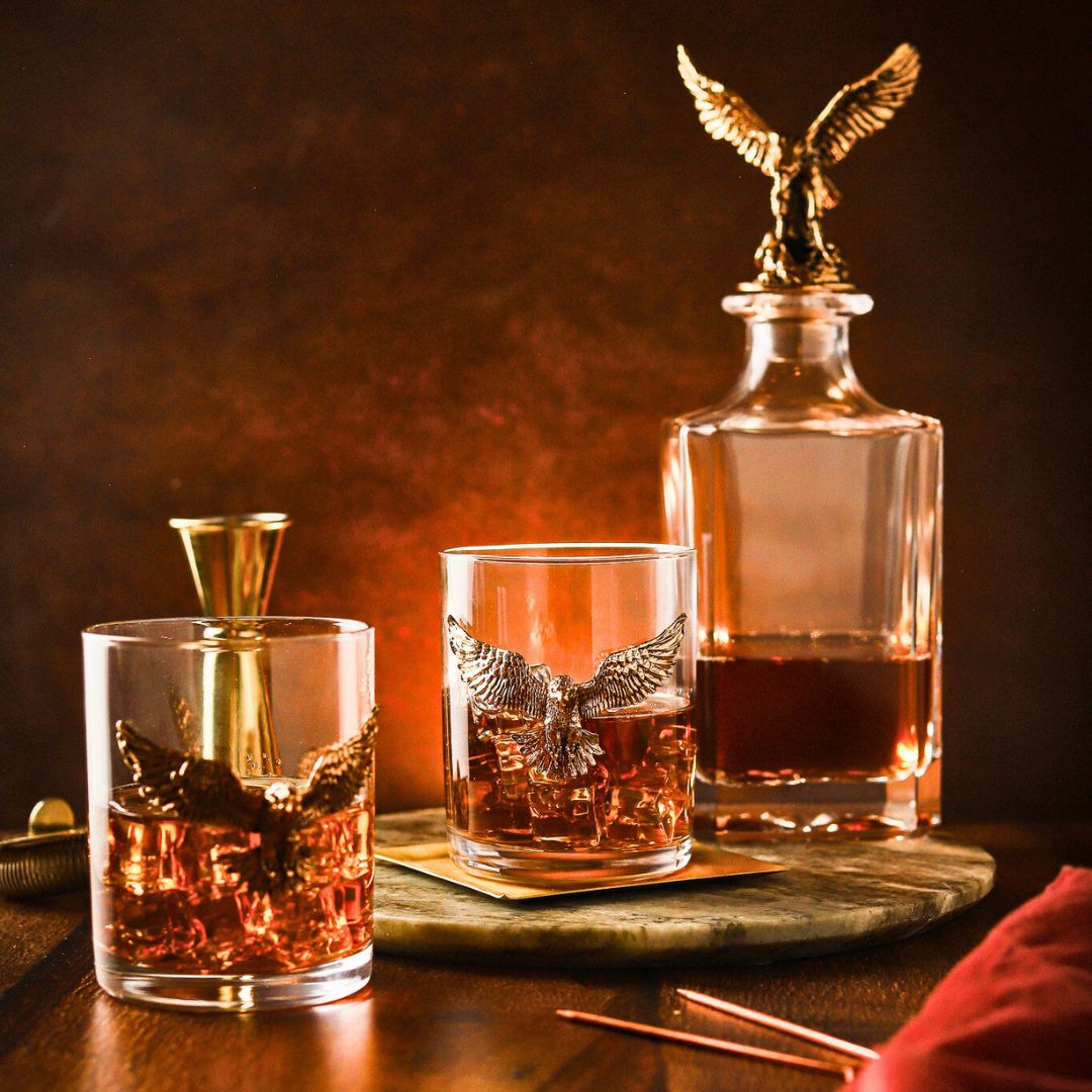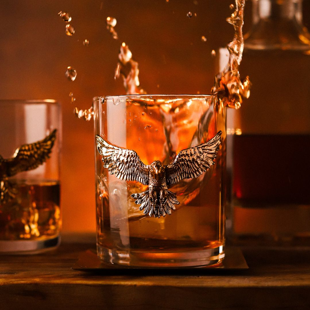 Featuring a majestic gold eagle is made of brass, the sturdy whiskey glasses are intricately crafted with longevity in mind. Guaranteed for everyday lifetime use.