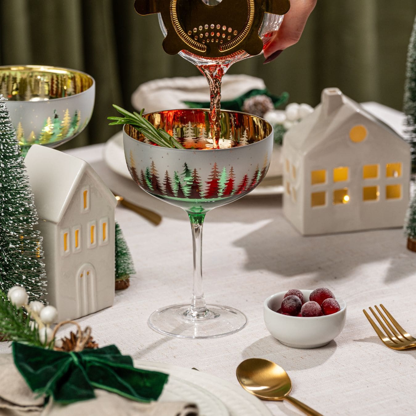 Engraved with a nostalgic wintery scene of pine trees, these Christmas coupe glasses are designed with a shimmery silver & green finish, and a dazzling gold interior that will light up the room.