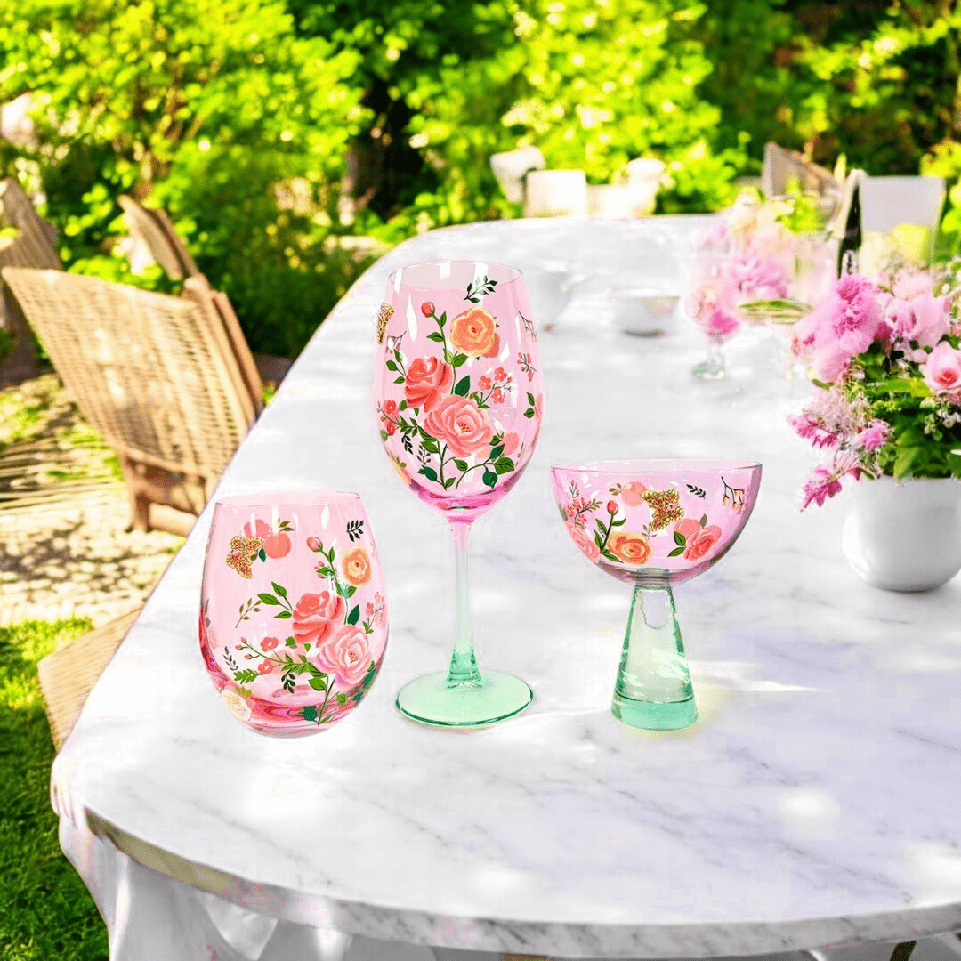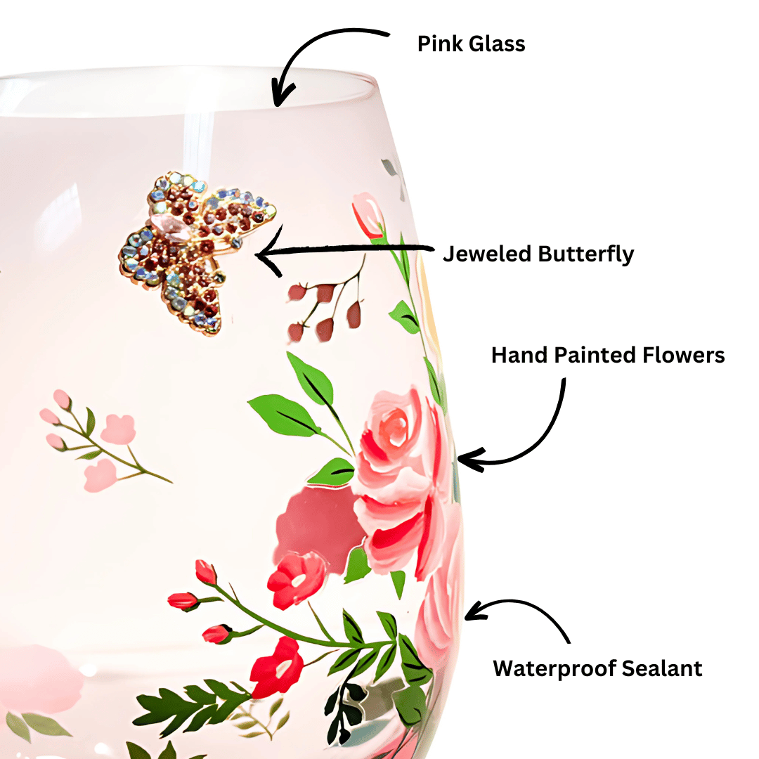 Featuring delicate white and red floral arrangements, a pink jeweled butterfly flutters above the flower onto a pink glass.